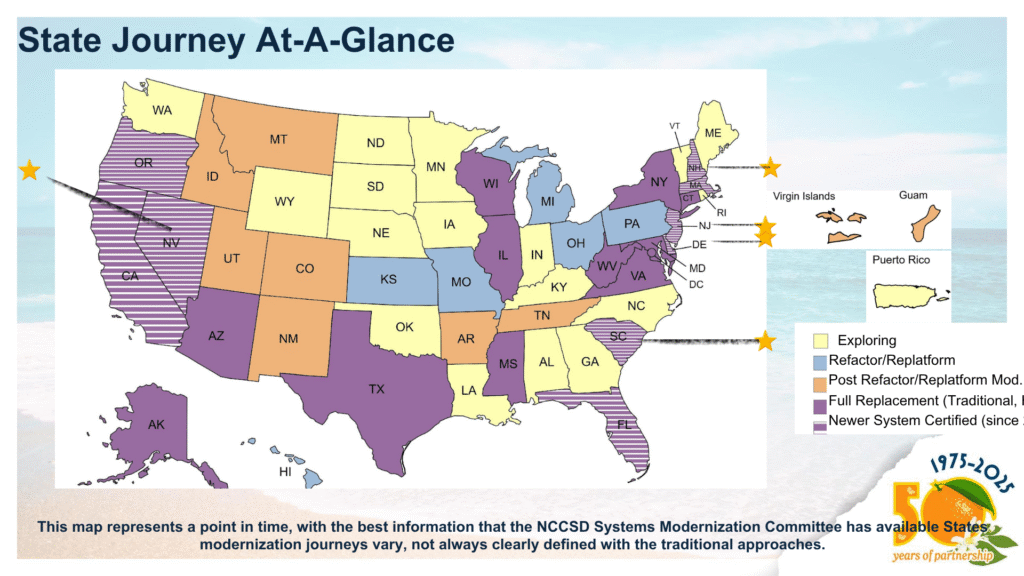 At a recent presentation by the National Council of Child Support Directors (NCCSD) Systems and Data Committee and the Office of Child Support Services (OCSS), a nationwide map was shared showing where states stand in their child support system modernization journeys. Each state is charting its own path—some are refactoring or replatforming, others are pursuing full system replacements, and many are taking hybrid approaches. No matter the strategy, the shared goal is clear: to replace outdated legacy systems with modern platforms that strengthen performance, compliance, and service delivery for families.